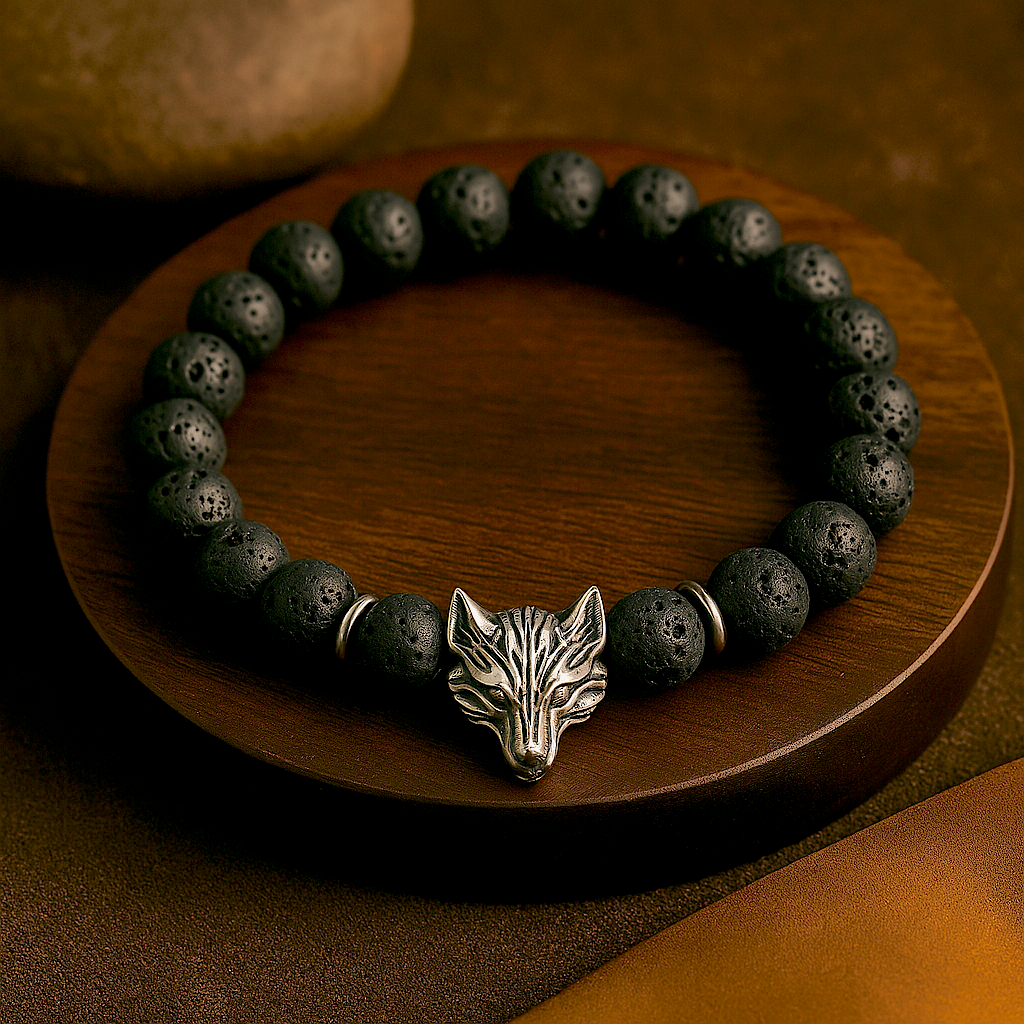 Material: Crafted from lava stone, known for its grounding properties and strength, paired with the symbolic wolf head to inspire leadership and courage.