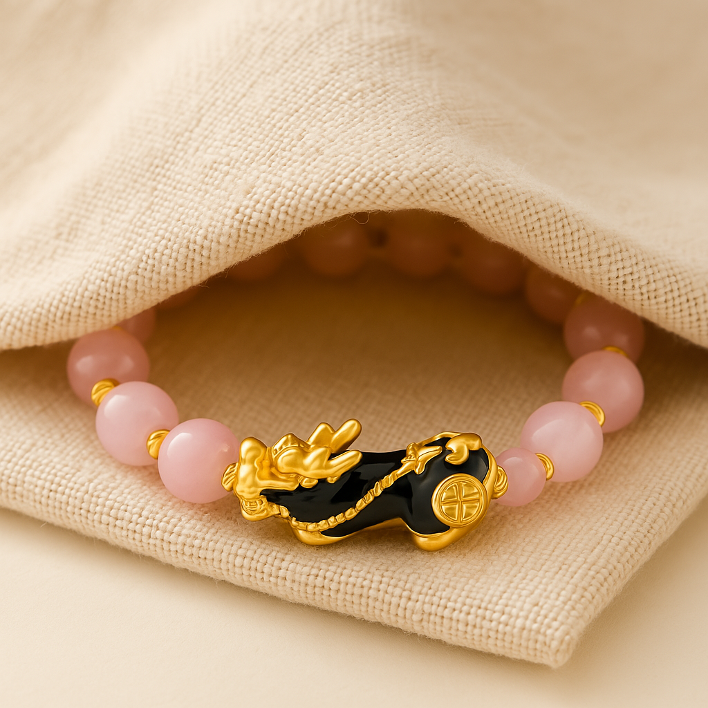 A Harmonious Design: The delicate combination of Rose Quartz and PiXiu integrates emotional connection and material success, empowering your journey towards balance.